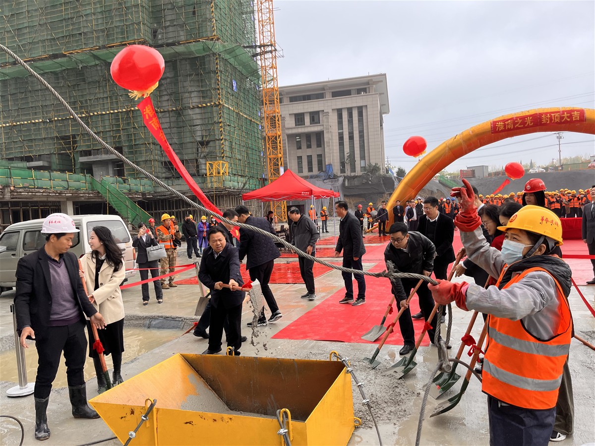 在宣布住宅楼正式封顶后,出席仪式的相关领导和嘉宾共同举行浇筑仪式。