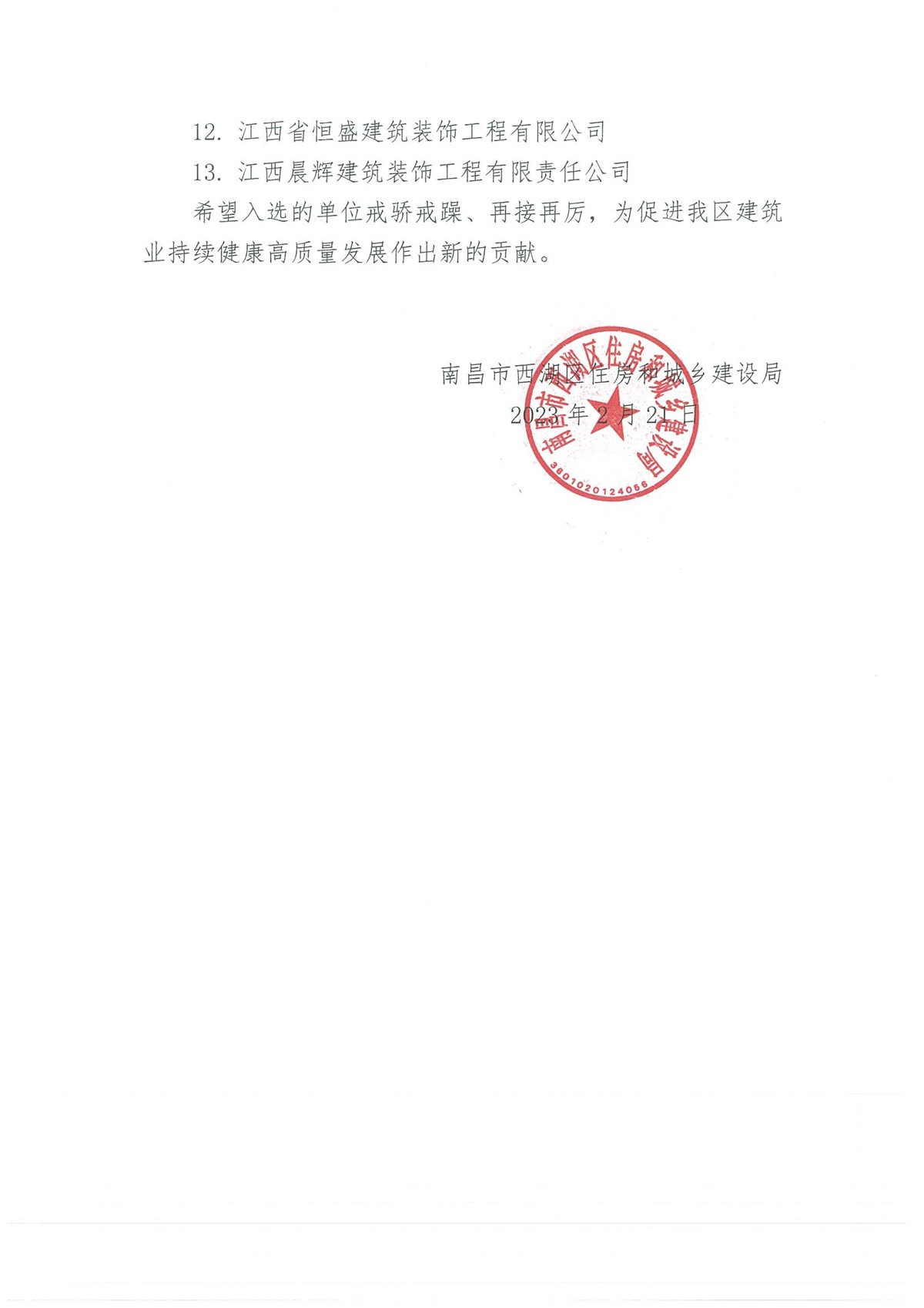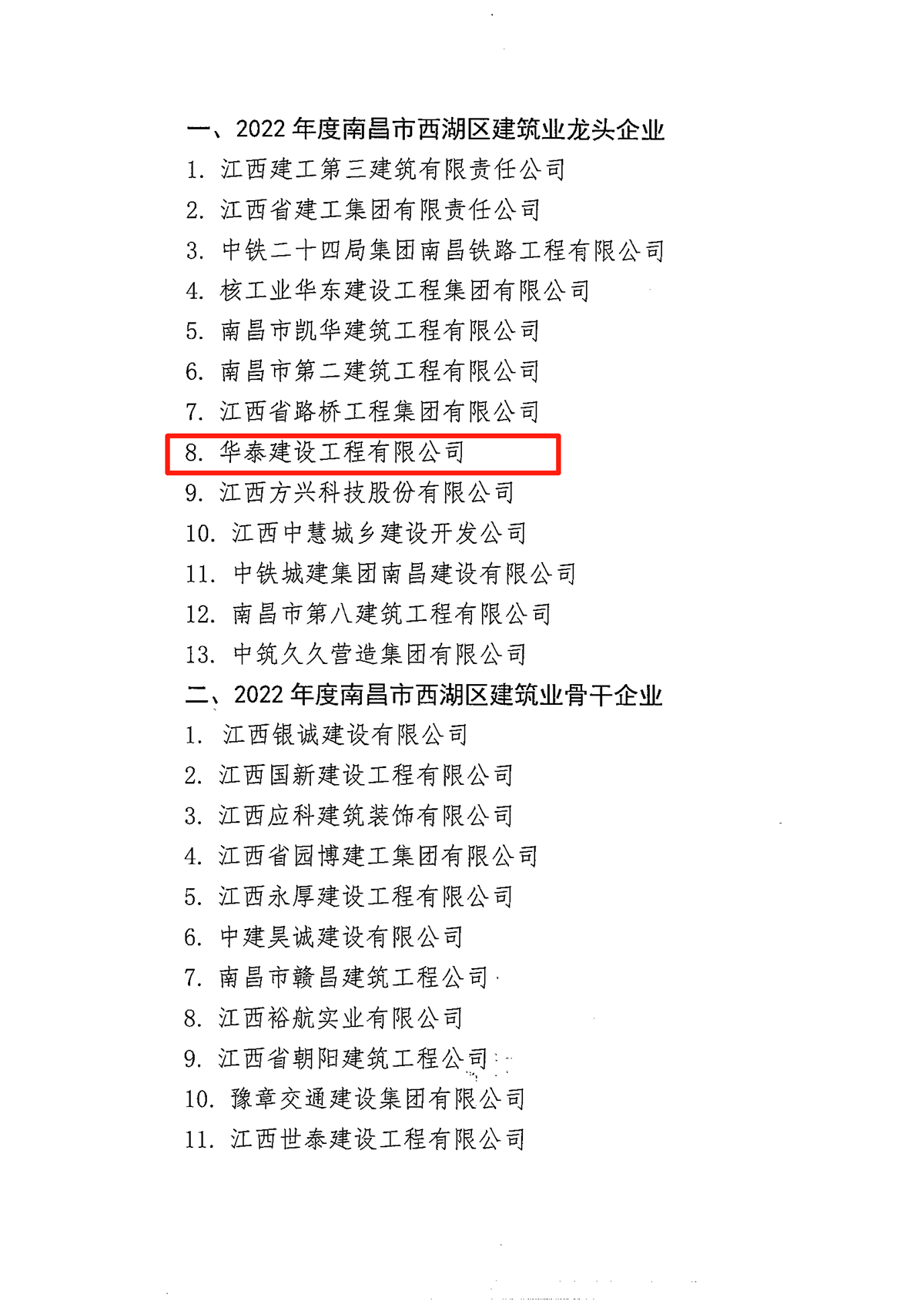 2023年2月21日,恰逢农历二月二龙抬头,在这个红红火火的日子,南昌市西湖区住房和城乡建设局发布了《关于公布2022年度南昌市西湖区建筑业龙头企业、骨干企业名单的通报》,经层层严格考评认定,乐竞体育凭借实干笃行与卓越品质获得“2022年度南昌市西湖区建筑业龙头企业”荣誉称号!这是继2023年1月获得“2022年度南昌市建筑业骨干企业”后的又一个荣誉认证。这不仅是对华泰建设的嘉奖与再次肯定,更是对华泰建设发展的激励与鞭策。